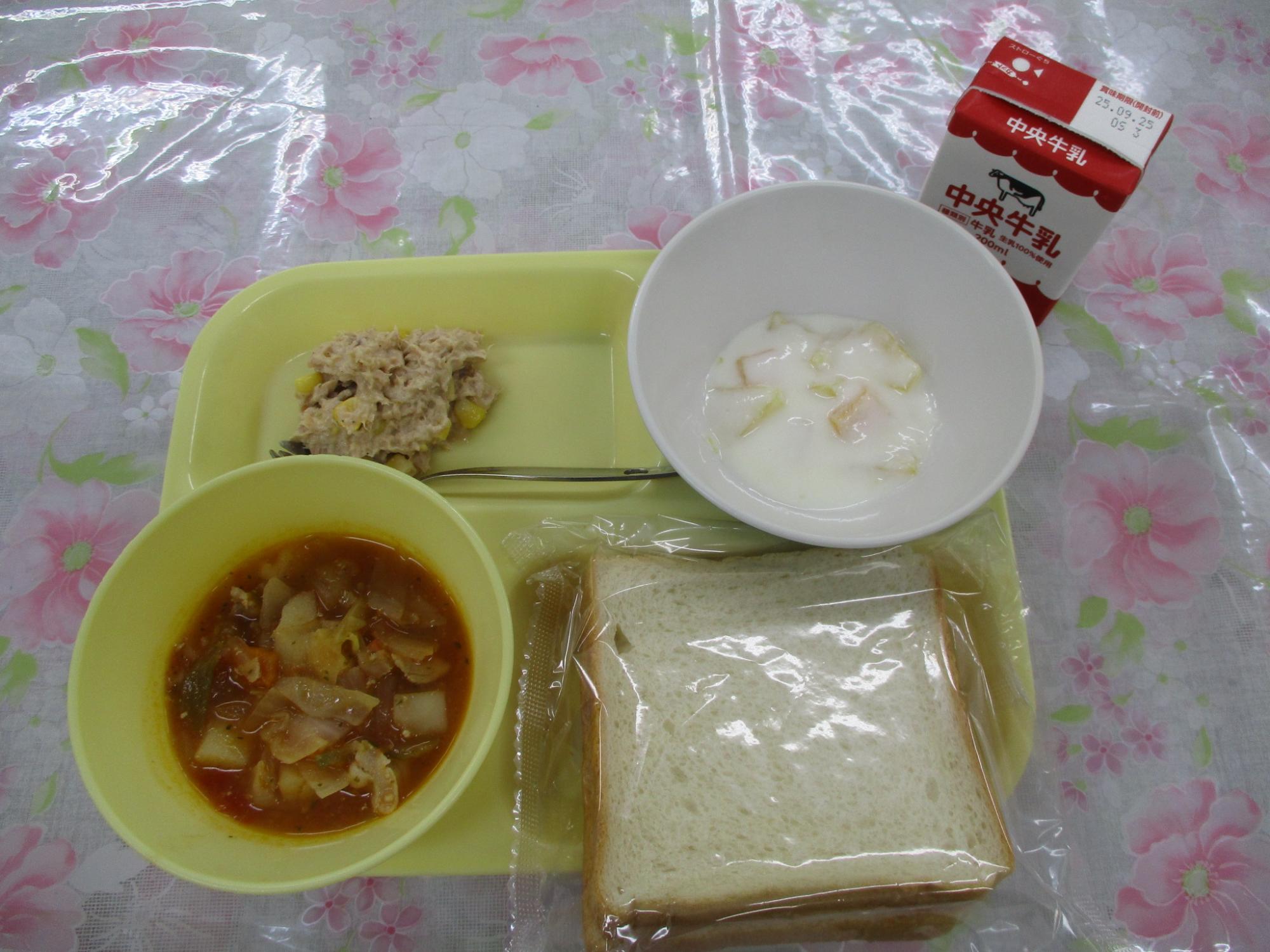 献立:スライスパン、牛乳、ツナサンドの具、ミネストローネ、フルーツのヨーグルトあえ