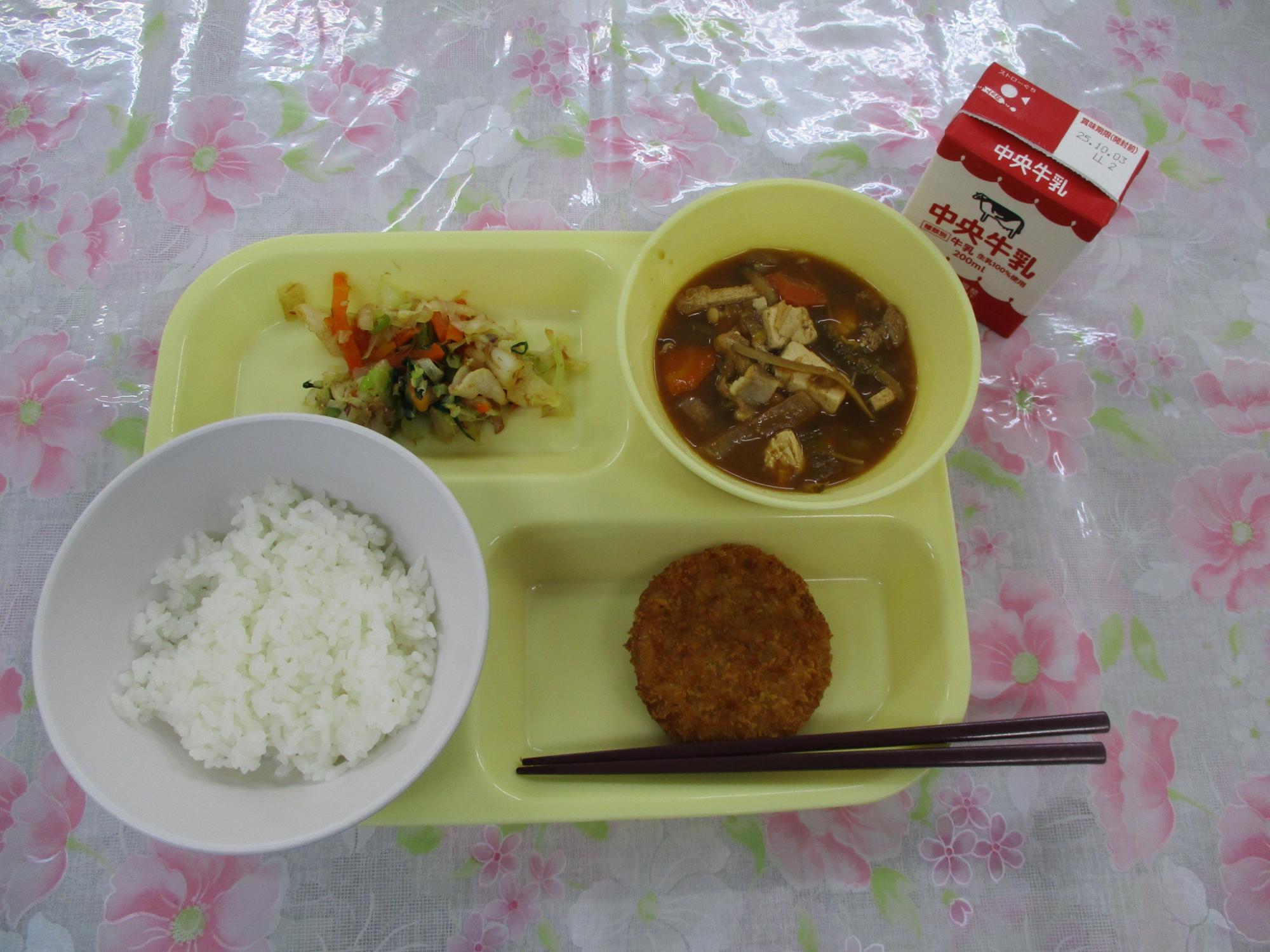 献立:麦ごはん、牛乳、米粉チキンカレーライス、豚肉のケチャップ炒め、キャベツサラダ