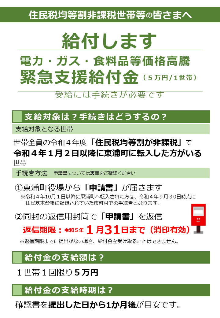 また、令和4年1月2日以降に東浦町に」転入した方については、令和4年11月下旬より「東浦町電力・ガス食料品等価格高騰緊急支援給付金申請書(請求書)」を順次発送する予定です。