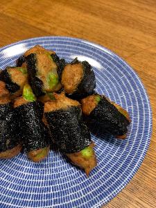 5.焼きのりを5cm×10cmに切り、焼きのりの上に4をのせ、半分にのりを折る。