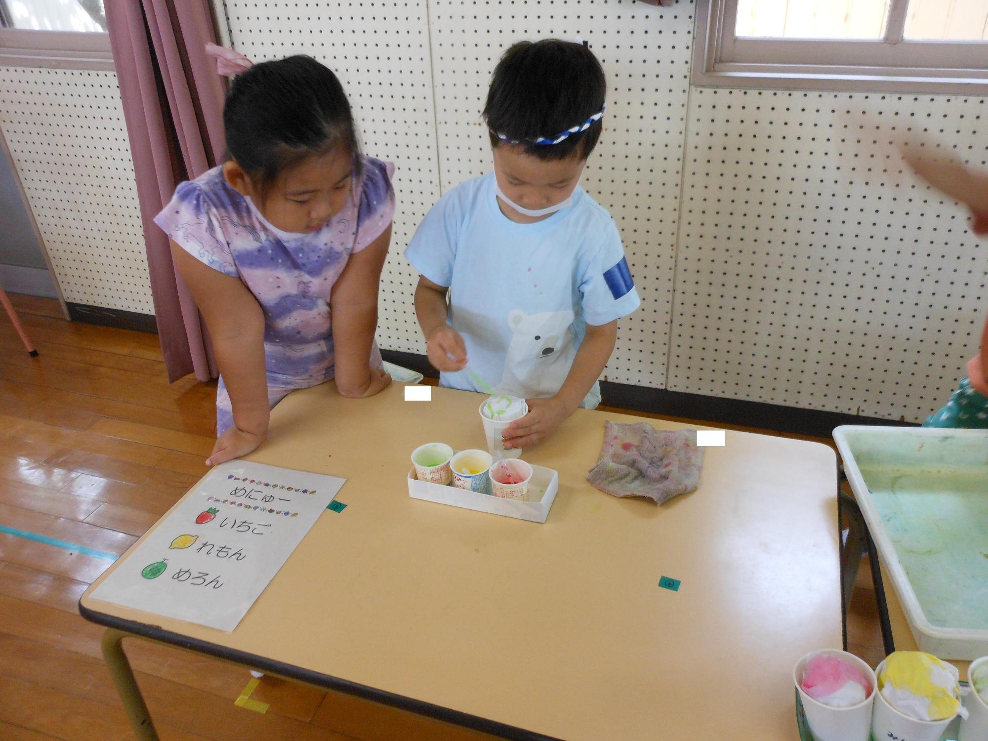 夏祭りでは、年長児のお店屋さんや保護者会の方が用意してくださったコーナーなどを巡って楽しみました。各コーナーの子どもたちの様子をお知らせします。