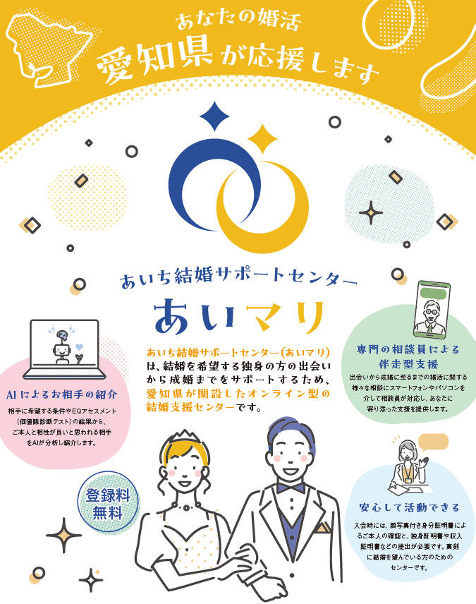 あいち結婚サポートセンター(愛称:あいマリ)は、結婚を希望する独身の方の出会いから成婚までをサポートするために、愛知県が開設したオンライン型の結婚支援センターです。
