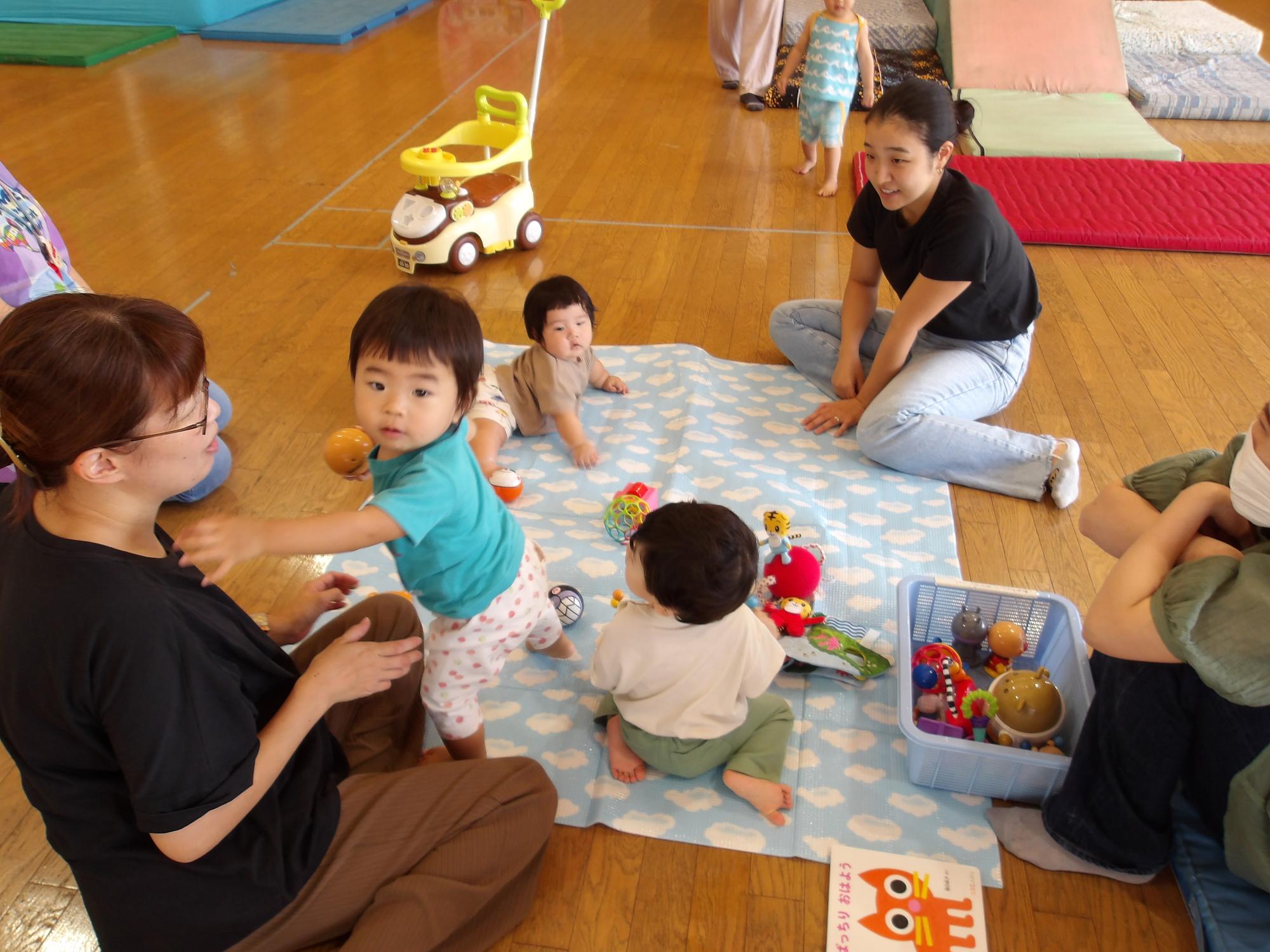 わらべ歌をうたいながらふれあい遊びをしたり保護者さん同士が交流や育児の情報交換をしたりとのんびり開催しています。
