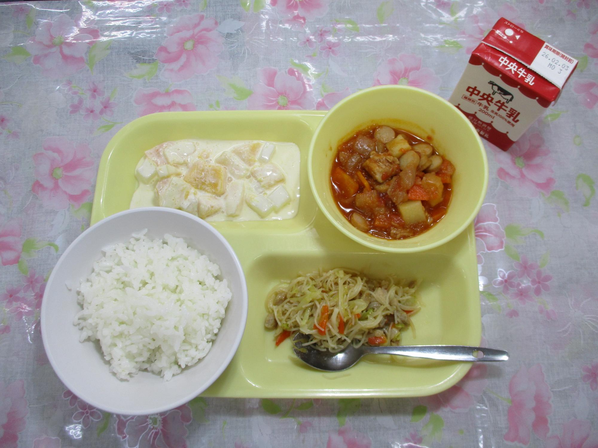 献立:ごはん、牛乳、牛肉のオイスターソース煮(ハオユーニューロウ)、春雨と野菜の甘酢あえ(バンサンスー)、八宝菜