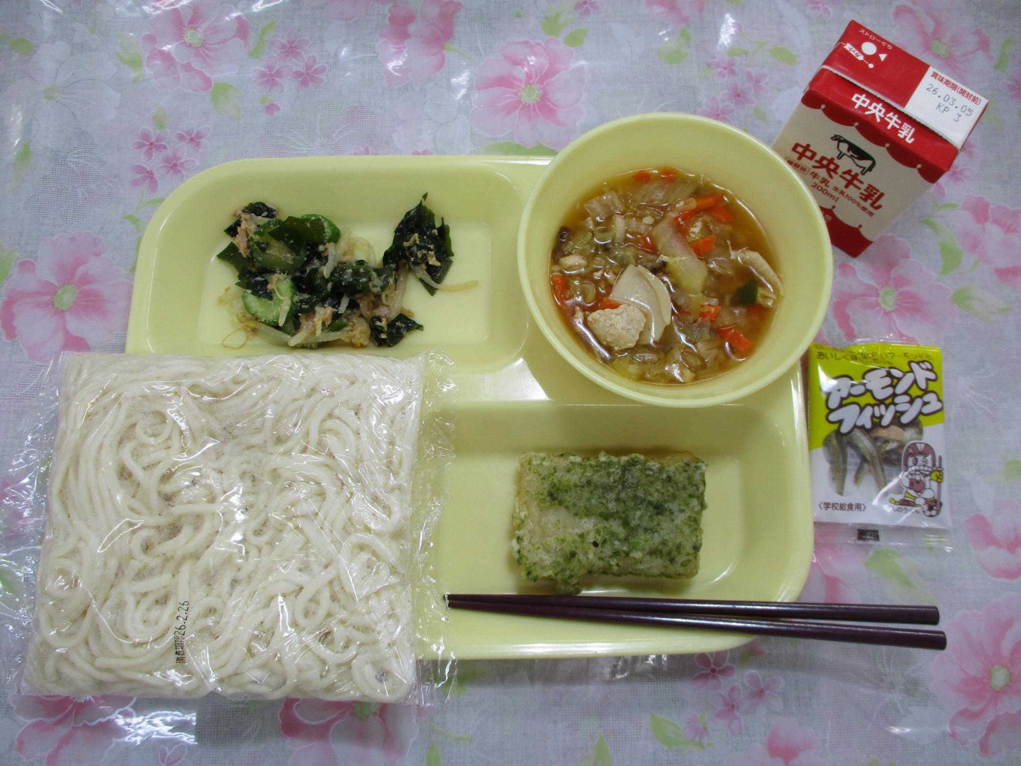 献立:ソフトめん、牛乳、五目汁、はんぺんの磯部揚げ、わかめともやしの酢の物、アーモンド小魚