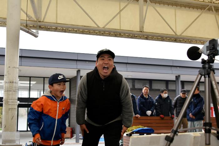 大会一番の盛り上がりをみせたのは大凧の部。大凧の部には、地元自治会をはじめ全8チームが参加しました。なかでも、北部中学校の生徒で構成する「北部中学校チーム」には大きな声援が送られました。北部中学校チームの大凧は、同中学校の美術部に所属する生徒と1、2年生の有志が絵を描き、組み立てはコミュニティと合同で行いました。大会当日、生徒らは、がんばって走ろう!などと互いに声を掛け合いながら、グラウンドを力強く走り回りました。