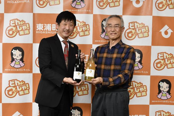 東浦町の耕作放棄地を開墾した畑でシャルドネを栽培し、そのシャルドネを使用したワインを製造したmasa wines shopの原田さんが町長を表敬訪問しました。ワインづくりを始めた経緯として、「親族から受け継いだ耕作放棄地状態の畑を今度どう活用していくか考えていました。そんな時、お酒は強くないけれど、ワインは好きで、中でもシャルドネワインが好きだったことから、私にとっておいしいワインを作りたいと思ったのが始まりです。東浦町はぶどうの栽培に適した土地であり、シャルドネの栽培にも適しているのではと考え、シャルドネづくりに挑戦することにしました」。農業は未経験だったそうですが、町内のぶどう農家さんや県外のワイナリーでぶどうやワインづくりを学び、今回の完成に至ったといいます。今後については「東浦町の特産品の1つになれるよう頑張って作り続けていきます」と意気込みを話しました。なお、今回完成したワインは、2022年に収穫したシャルドネを1年以上熟成させたスティルス白ワインと2023年に収穫したシャルドネから作られた微発泡のワインの2種類があり、約100本ずつの限定販売をするそうです。