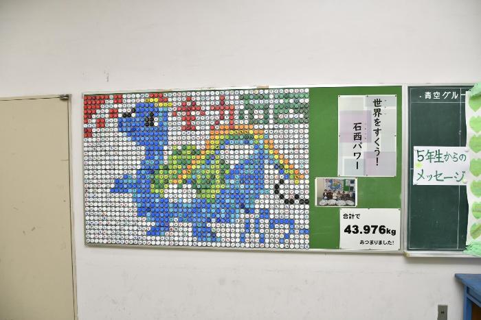 石浜西小学校の児童がペットボトルキャップアートに挑戦しました!石浜西小学校ではペットボトルキャップの回収に取り組んでおり、集めたペットボトルキャップは、世界の子どもたちのワクチン接種費用として寄付されます。今年度集まったペットボトルキャップはなんと約44キロ!そのうち、約1500個のペットボトルキャップを使い、アートを作成しました。デザインは令和5年度の石浜西小学校のスローガン「全力石西パワー」と、石浜西小学校のマスコットキャラクター「イシニッシー」をキャップの色を巧みに使って表現しています。ペットボトルキャップアートを企画した田中さんは「ペットボトルキャップがこんなに集まるとは思ってもみませんでした。せっかく友達も家族も積極的に回収に協力してくれたので、ペットボトルキャップ回収の集大成として何かみんなで協力して作品を作りたいと思い企画しました。完成したペットボトルキャップアートを見ると達成感を感じます!」と話してくれました。