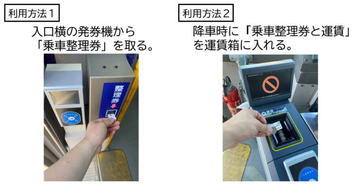 乗車時に、入口横の整理券発行機から「乗車整理券」をお取りください。降車時は、運賃(100円もしくは回数券)と整理券を運賃箱に入れてください。運賃と同じ金額がない場合は、あらかじめ運転手横の両替機で両替してください。